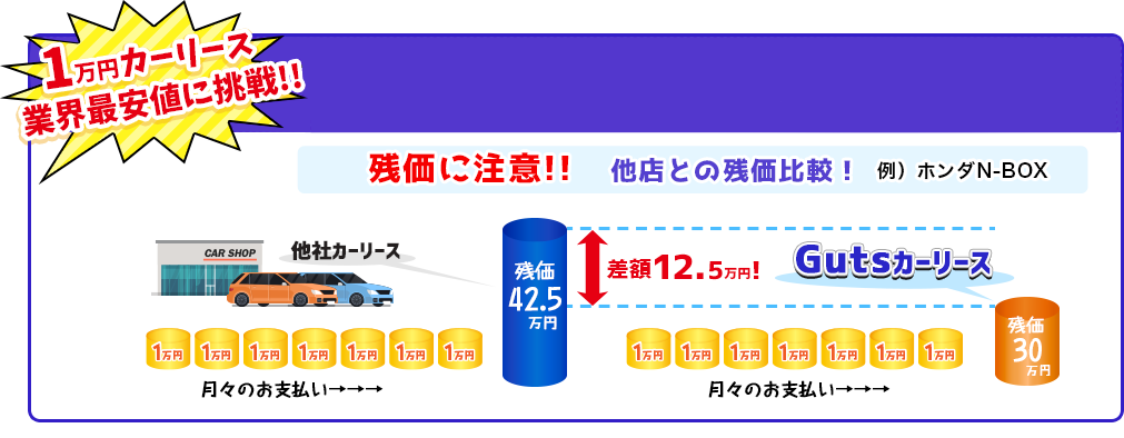 Gutsがご提供するカーリースは月々10,000円〜で新車に乗れる非常に便利でお得なプランです。