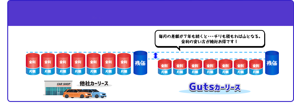 「乗っちゃお」は、業界でもトップクラスの低金利だから、支払総額を安くできます 。また、金利が低いと残価を安く設定できるので、リース満了時もお得に乗り換えできます。